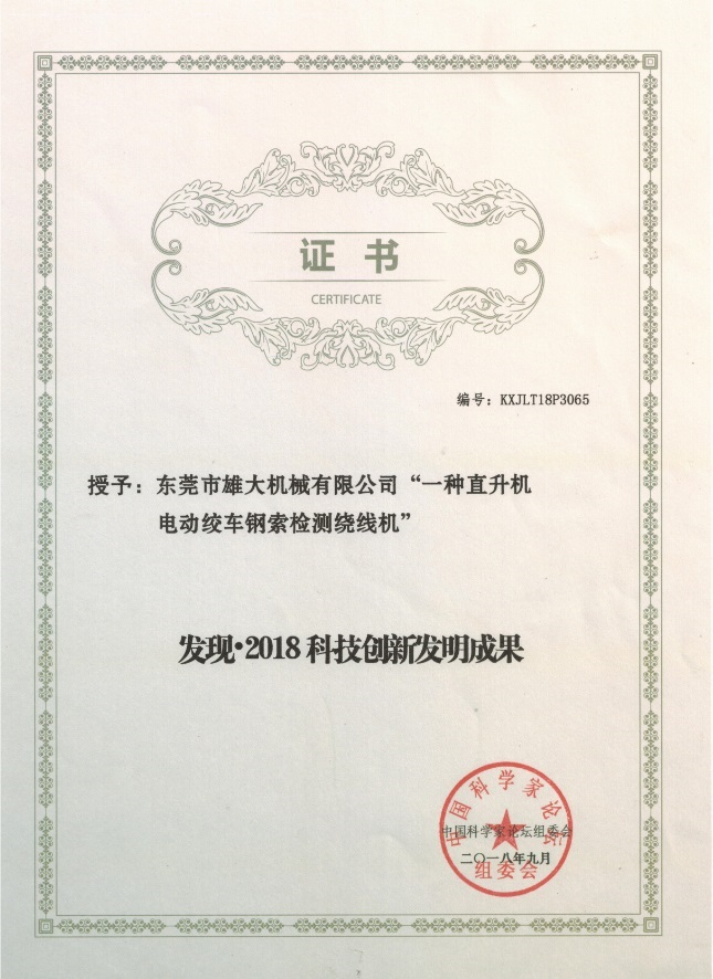 2018年9月12日我司受邀參加由著明科學(xué)家、時(shí)任全國(guó)人大常委會(huì)副委員長(zhǎng)、中國(guó)科協(xié)主席周光召院士在北京主辦的主題為:“建設(shè)世界科技強(qiáng)國(guó)與新時(shí)代科技創(chuàng)新”的論壇。展示我司科技成果《一種直升機(jī)電動(dòng)絞車(chē)鋼索檢測(cè)繞線機(jī)》,并獲得中國(guó)科技學(xué)論壇頒發(fā)的“2018科技創(chuàng)新發(fā)明成果”證書(shū)。